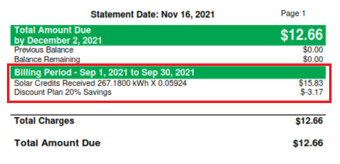 The mc² community solar subscription invoice will be billed after the monthly generation data from the community solar project is reconciled and validated with the utility which means that there could be up to a one-month lag of the subscription fee invoice depending on your meter read cycle timing. To reconcile the net savings for a specific month, please refer to the billing period listed on your recent mc² subscription fee invoice and compare it to the corresponding generation period listed on your utility bill.